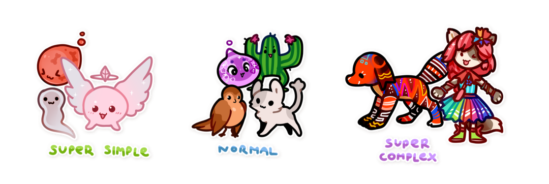 Q: Which designs are simple / complex for you?A: I call them super simple and super complex, because they must be really easy/hard to draw for price changing.Mainly, super simple characters: